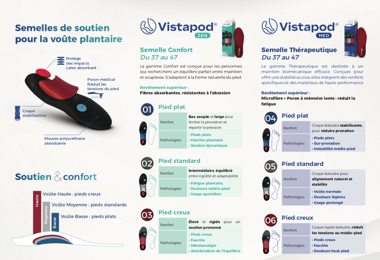 Vistapod simplifie l’accès à l’orthopédie du quotidien. Les semelles sont disponibles en libre service et classées selon les trois grands types de pieds :